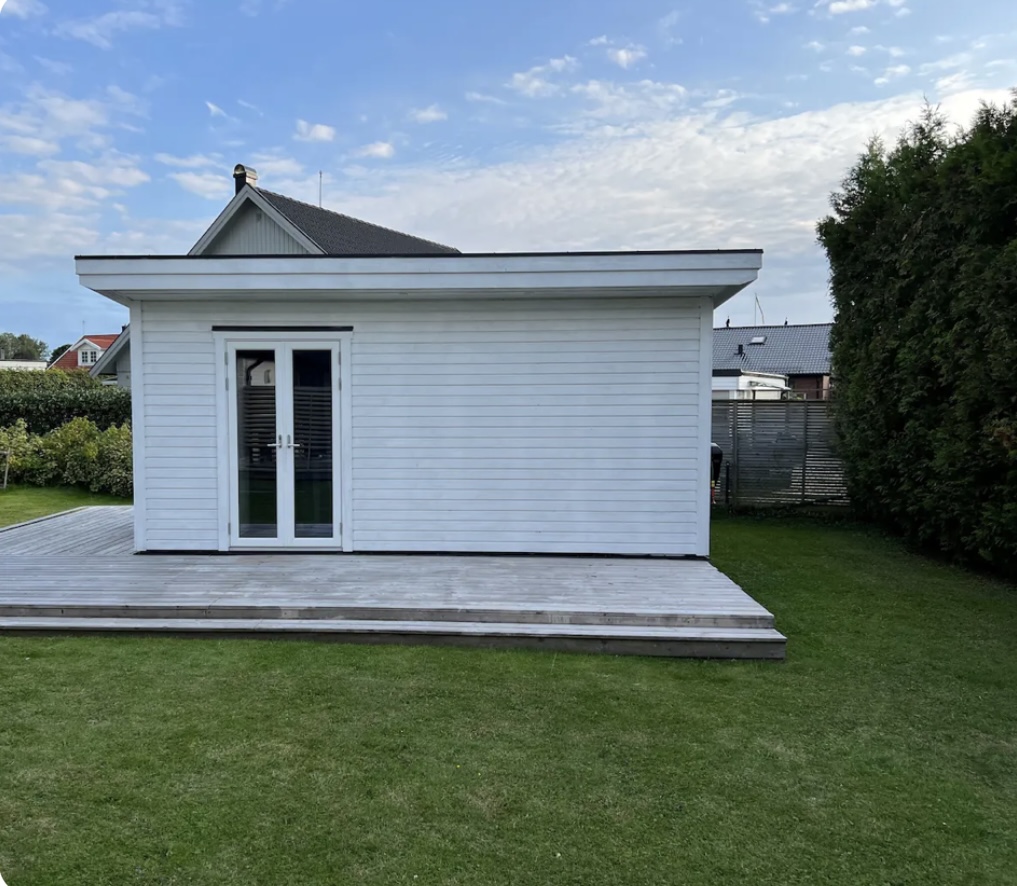 Attefallshus med möbler. Toalett, sovrum och allrum med kök.
