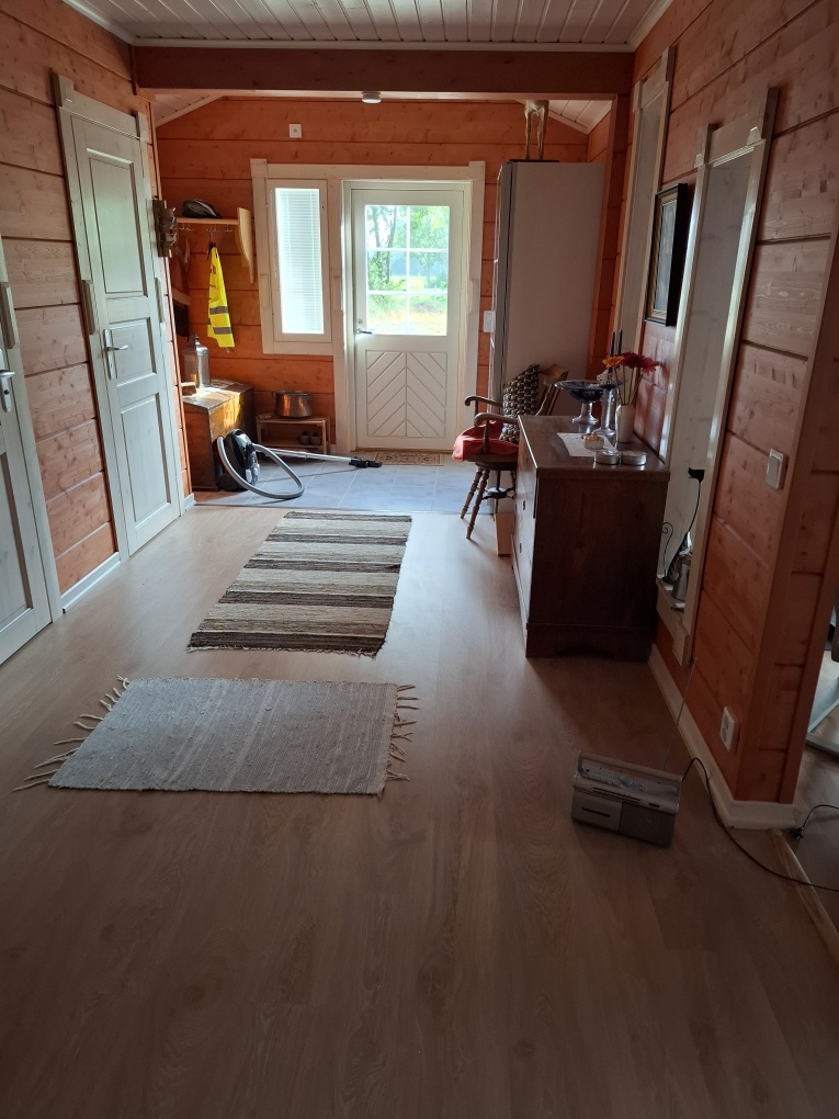 Timmerhus med golvvärme med inbyggd altan med golvvärme öppen vedspis 2 st toaletter dusch