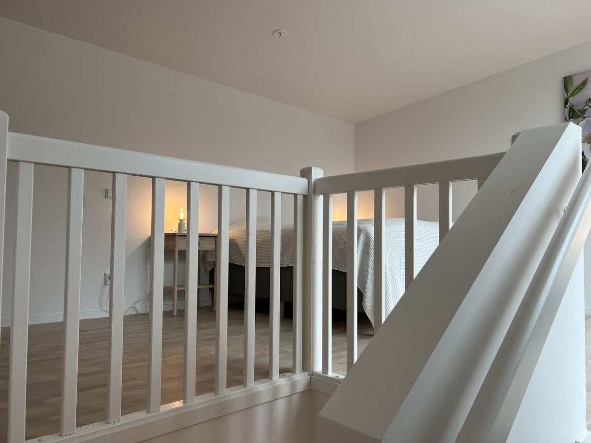 55 kvm fördelat på två plan där sovrummet är på ovanvåningen.