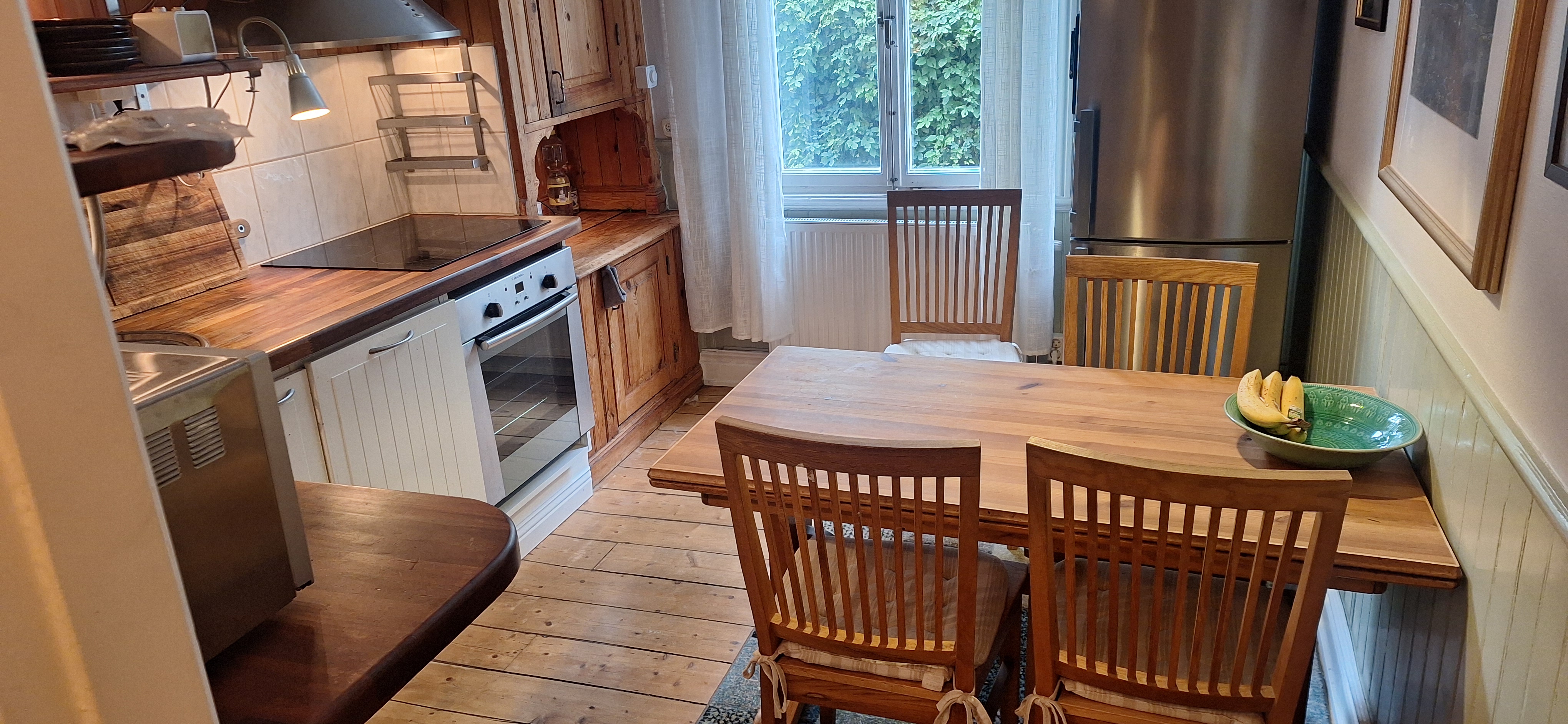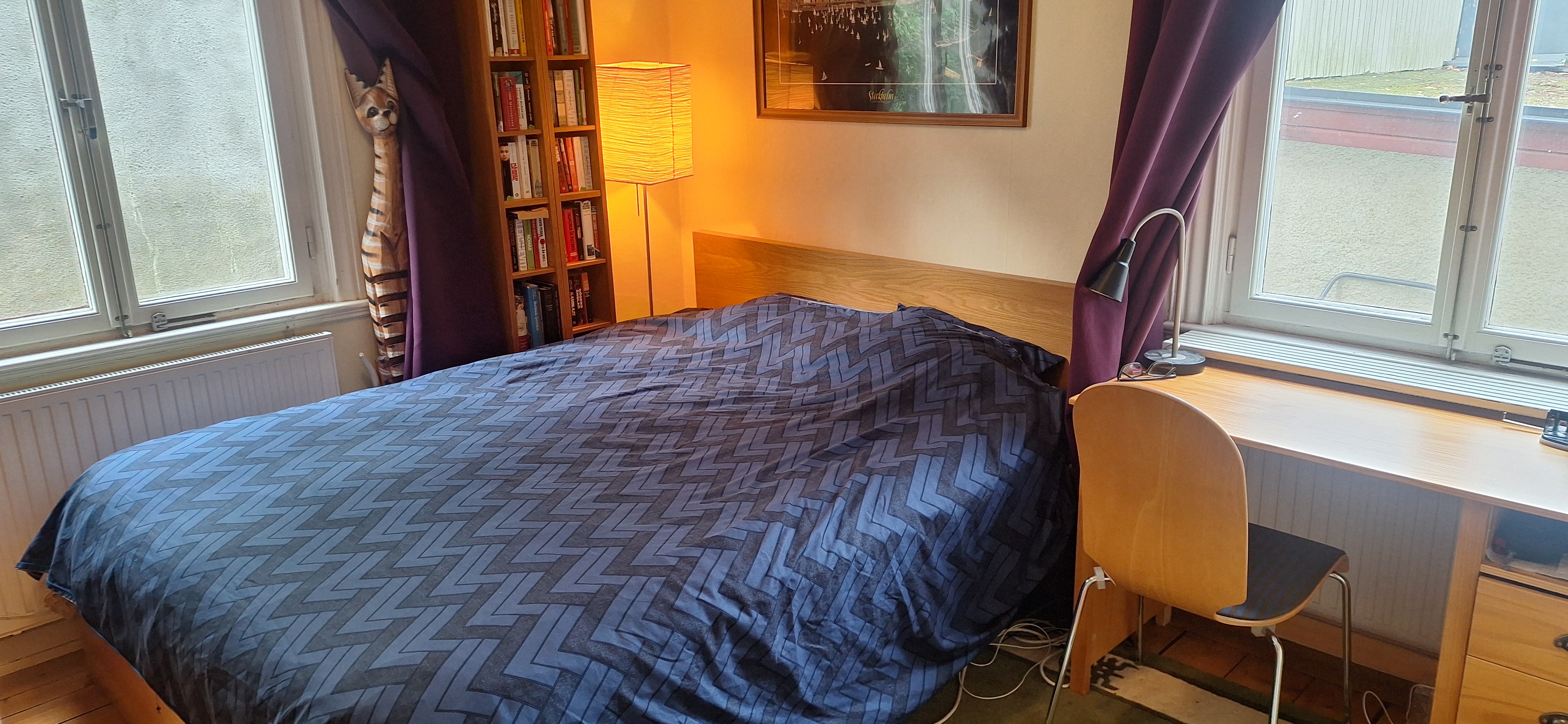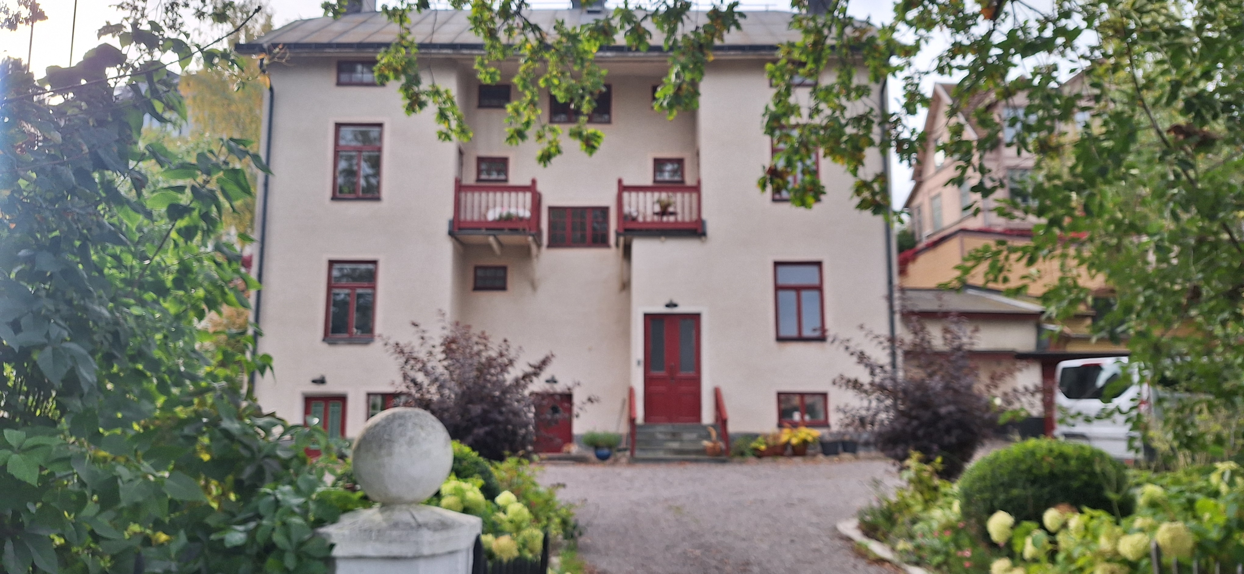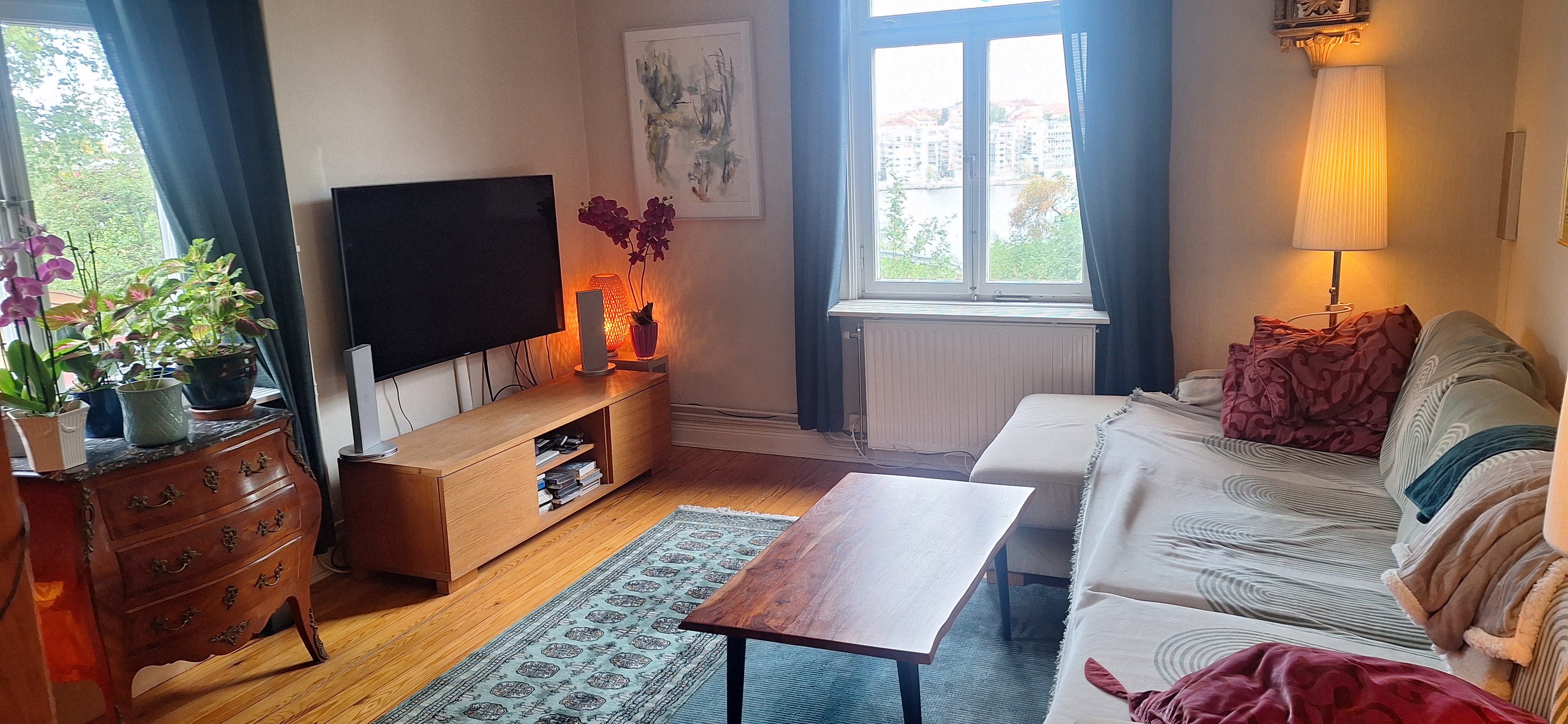 (You find the english text above) Vår sekelskifteslägenhet, med fönster i fyra väderstreck, ligger i marknivå inbäddad i trädgårdens grönska. Från hallen som är välkomnande och rymlig kommer du vidare in i köket med öppen planlösning mot vardagsrummet och glasverandan. Det stora sovrummet har dubbelsäng och rymliga garderober. I arbetsrummet finns en bred extrabädd, en futon. I vardagsrummet och i arbetsrummet finns fungerande kakelugnar. Hallen och det sköna badrummet med morgonsol har golvvärme. Från glasverandan har vi utsikt över Mälaren och ett stenkast från huset finns en badplats med stor solbrygga och badstegar. Under sommarhalvåret liknar vår lilla gata närmast en badort, med människor som strosar i badrock ner för berget för att ta sig ett morgon eller kvällsdopp. I trädgården finns flera sittgrupper som delas med de andra som bor i huset. Här finns också den fullt utrustade tvättstugan. Till lägenheten hör en egen parkeringplats på gården. ENG: Our turn of the century apartment, with windows in all four directions, is on the ground floor embedded by greenery and garden. From the roomy hall you reach the kitchen and, with the open floorplan, you proceed into the living room and a glass porch. The master bedroom has a large double bed and spacious wardrobes. In the study there are more wardrobes and an extra bed, a futon. In the living room and in the study there are traditional tiled stoves. The hall and the bathroom have floor heating. From the glass porch we have a view over the lake Mälaren and a stones throw from the house there is a swimming area with a large jetty from where you can dive into the lake. In summertime our little street reminds you of a seaside resort, with people strolling by in bath robes on their way down the hill for a swim. In the garden there are different spots with outdoor furnitures which you share with the neighbours in the house. You also find a fully equipped laundry here. We have our own parking lot outside the house. Five minutes downhill you find Gröndals small town center with grocery store, drugstore, library, flower shop and one of the best bakeries/ cafés in Stockholm. Here you also find busses and a tram that take you to the city of Stockholm in twenty minutes. With a car you reach most destinations and other suburbs in 15 minutes as the big thoroughfare Essingeleden passes by Gröndal. There is a big playground area for children in Gröndal center and you can easily reach the popular big park area around Vinterviken with large grass lawns, cafés and small gardens by the sea. You can also take long walks along the waterfront on comfortable wooden bridges - or you can rent a kajak. Nearby there is a steamboat that takes you to the city of Stockholm or to Drottningholms Royal Castle with the magnificent park - and to other exciting destinations around Mälaren.