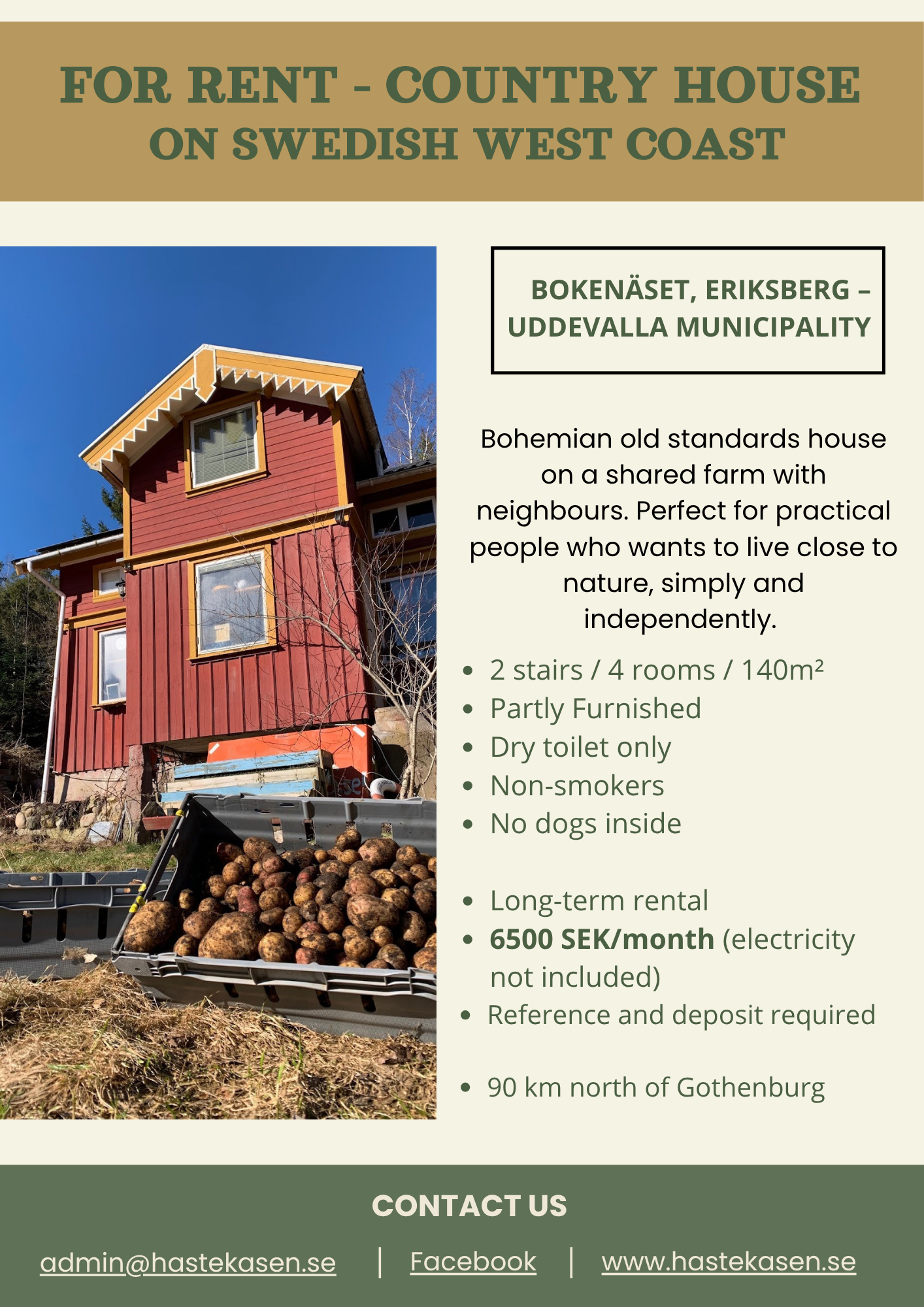 Ett hus på landet i slutet av en väg med stor skog i ryggen och 800 meter till havet (Koljöfjorden). Huset är bohemiskt och gammalt och har bara tillgång till torrtoalett. Det ligger på en fastighet som omfattar 14 hektar och förvaltas delvis av en stiftelse, vars syfte är att skapa en
